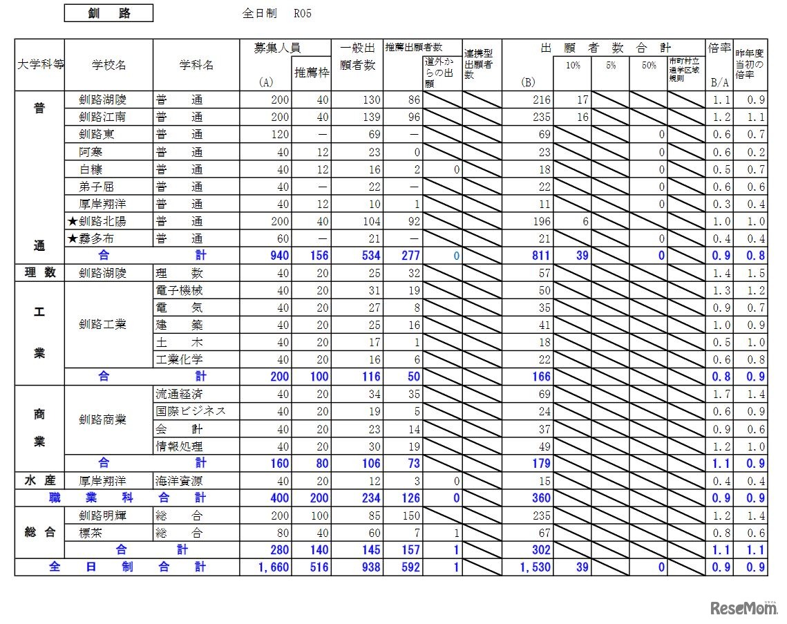 画像出典:北海道教育委員会「令和5年度公立高等学校入学者選抜の出願状況(令和5年1月23日正午現在の数)」 釧路学区