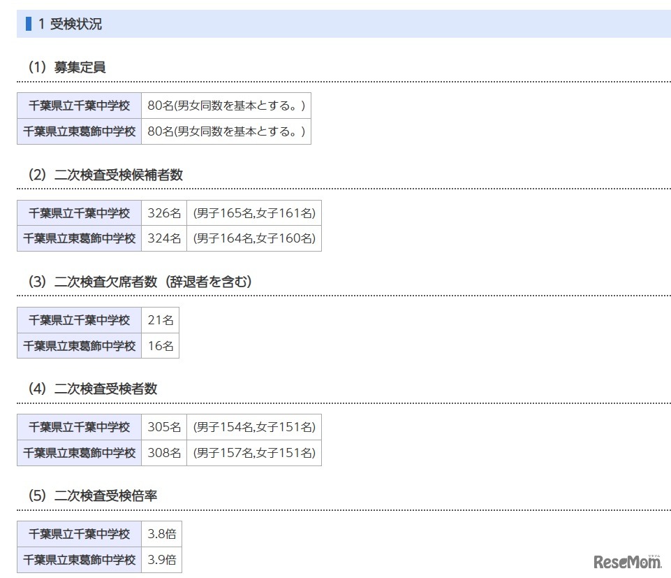 千葉県教育委員会は2023年1月24日、2023年度(令和5年度)千葉県立中学校入学者決定における二次検査の受検状況を公表した。受検倍率は、千葉中学校が3.8倍、東葛飾中学校が3.9倍。入学許可候補者内定者の発表は1月31日午前9時から。