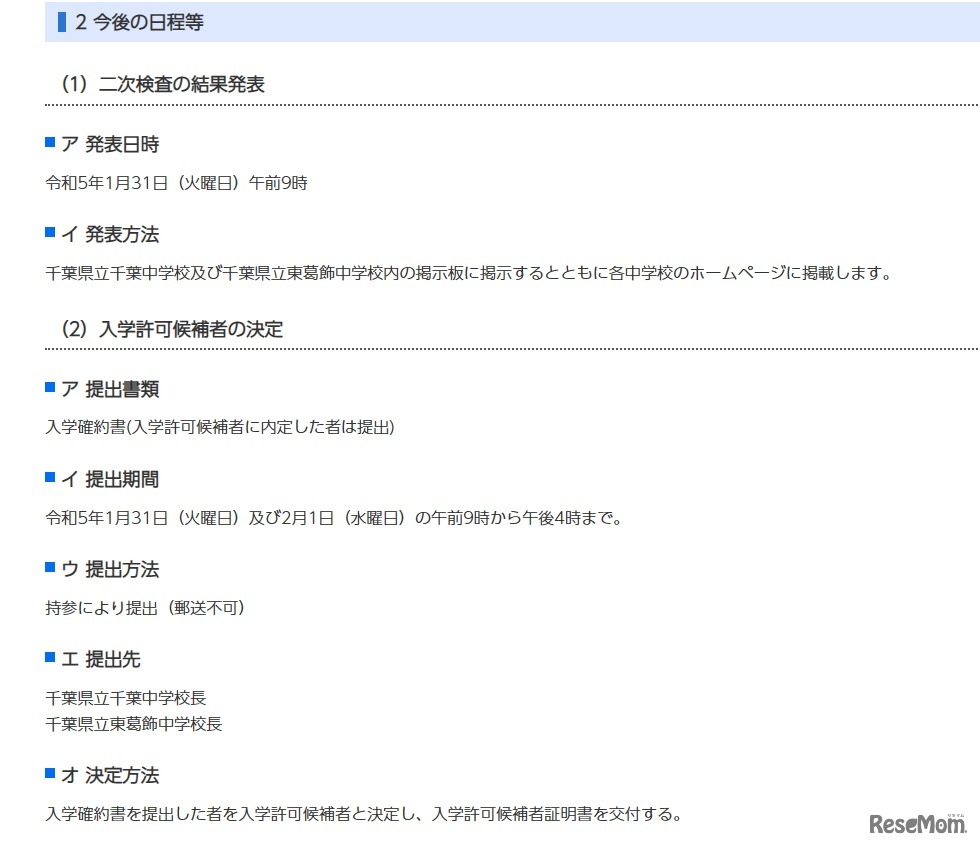 千葉県教育委員会は2023年1月24日、2023年度(令和5年度)千葉県立中学校入学者決定における二次検査の受検状況を公表した。受検倍率は、千葉中学校が3.8倍、東葛飾中学校が3.9倍。入学許可候補者内定者の発表は1月31日午前9時から。