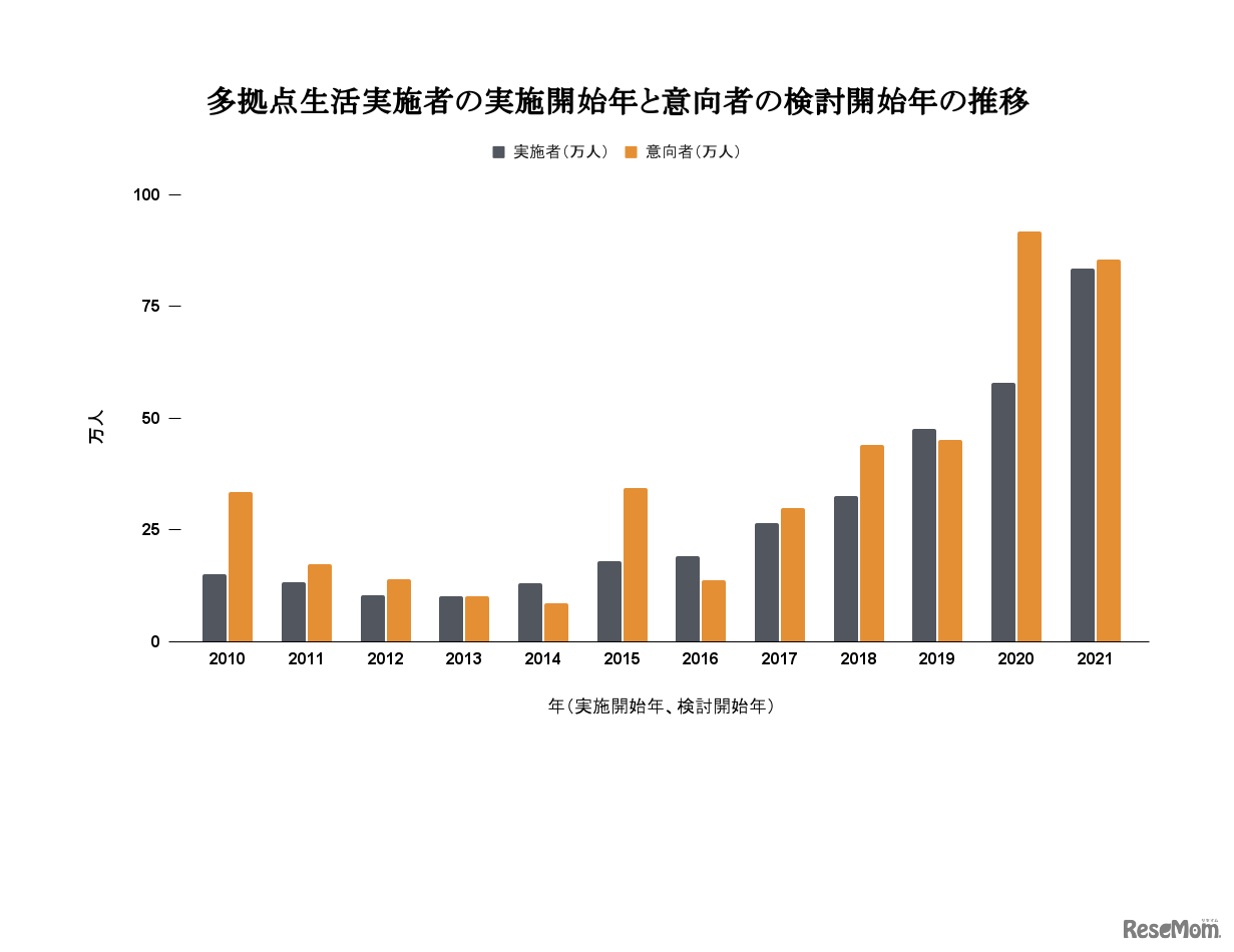 画像出典:MoonBase 多拠点生活実施者の実施開始年と意向者の検討開始年の推移