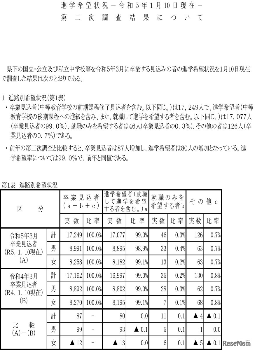 岡山県教育委員会は2023年1月25日、2023年3月中学校卒業見込者の進学希望状況第2次調査結果(1月10日現在)を発表した。中学卒業見込者1万7,249人のうち、進学希望者は99.0%。県立高校全日制希望者は1万1,505人で、志願倍率は1.06倍だった。