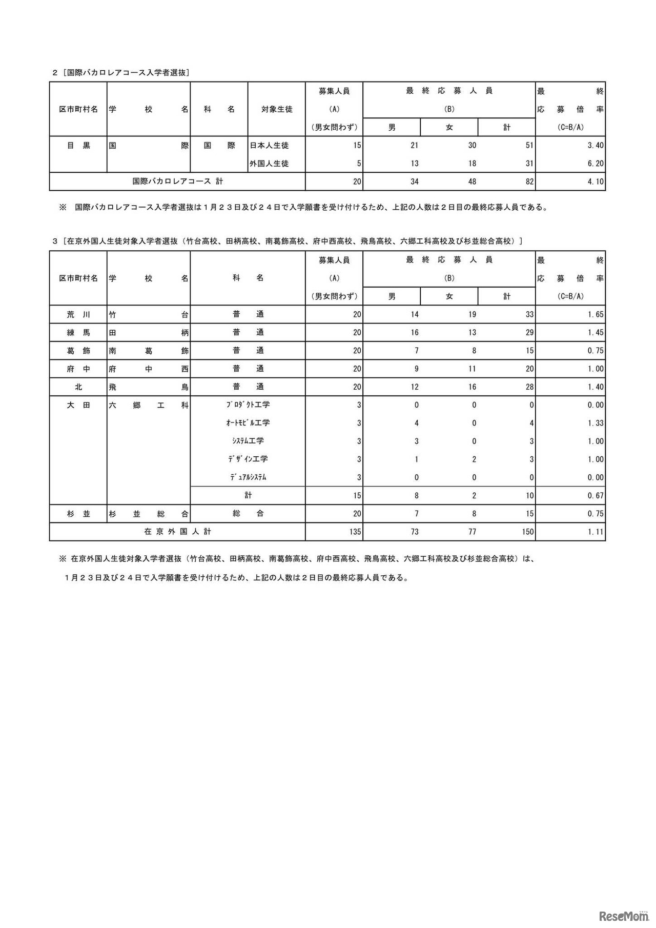 令和5年度東京都立高等学校入学者選抜応募状況:国際バカロレアコース入学者選抜・[在京外国人生徒対象入学者選抜