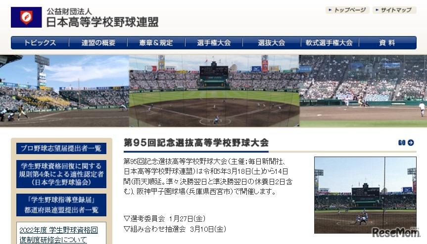 第95回記念選抜高等学校野球大会の選考委員会が2023年1月27日に開かれ、出場校36校が決定した。21世紀枠は城東(徳島)、石橋(栃木)、一般選考は彦根総合(滋賀)等3校が初出場する。組合せ抽選会は3月10日。大会は3月18日から14日間、阪神甲子園球場で開催される。