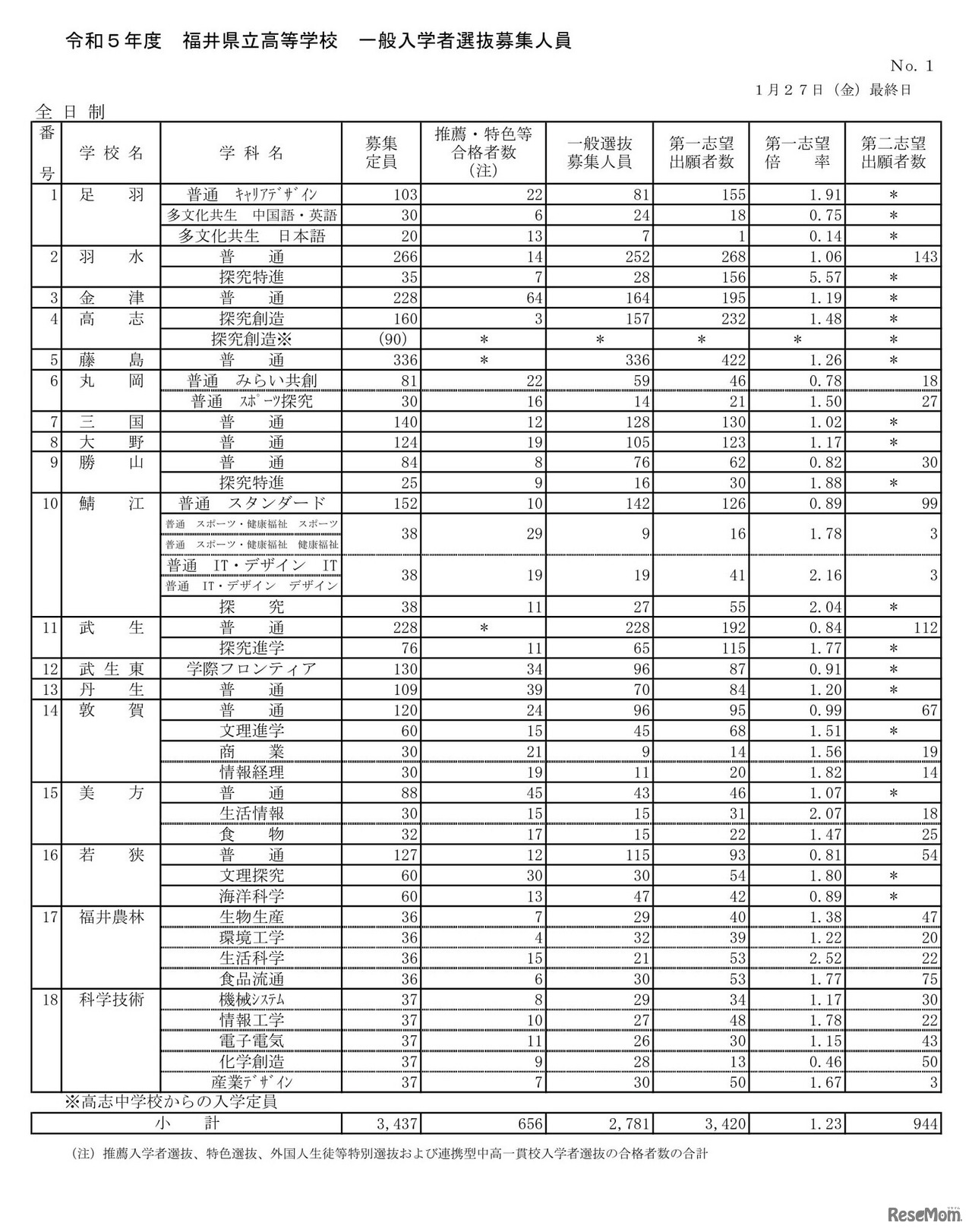 画像出典:福井県 2023年度(令和5年度)福井県立高等学校一般入学者選抜の出願状況(1月27日時点)