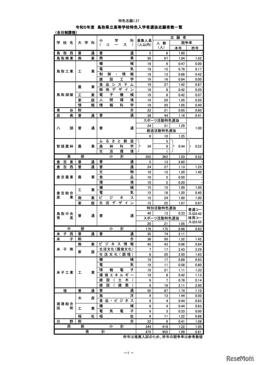 画像出典:鳥取県教育委員会 令和5年度鳥取県立高等学校特色入学者選抜志願者数一覧(全日制課程)