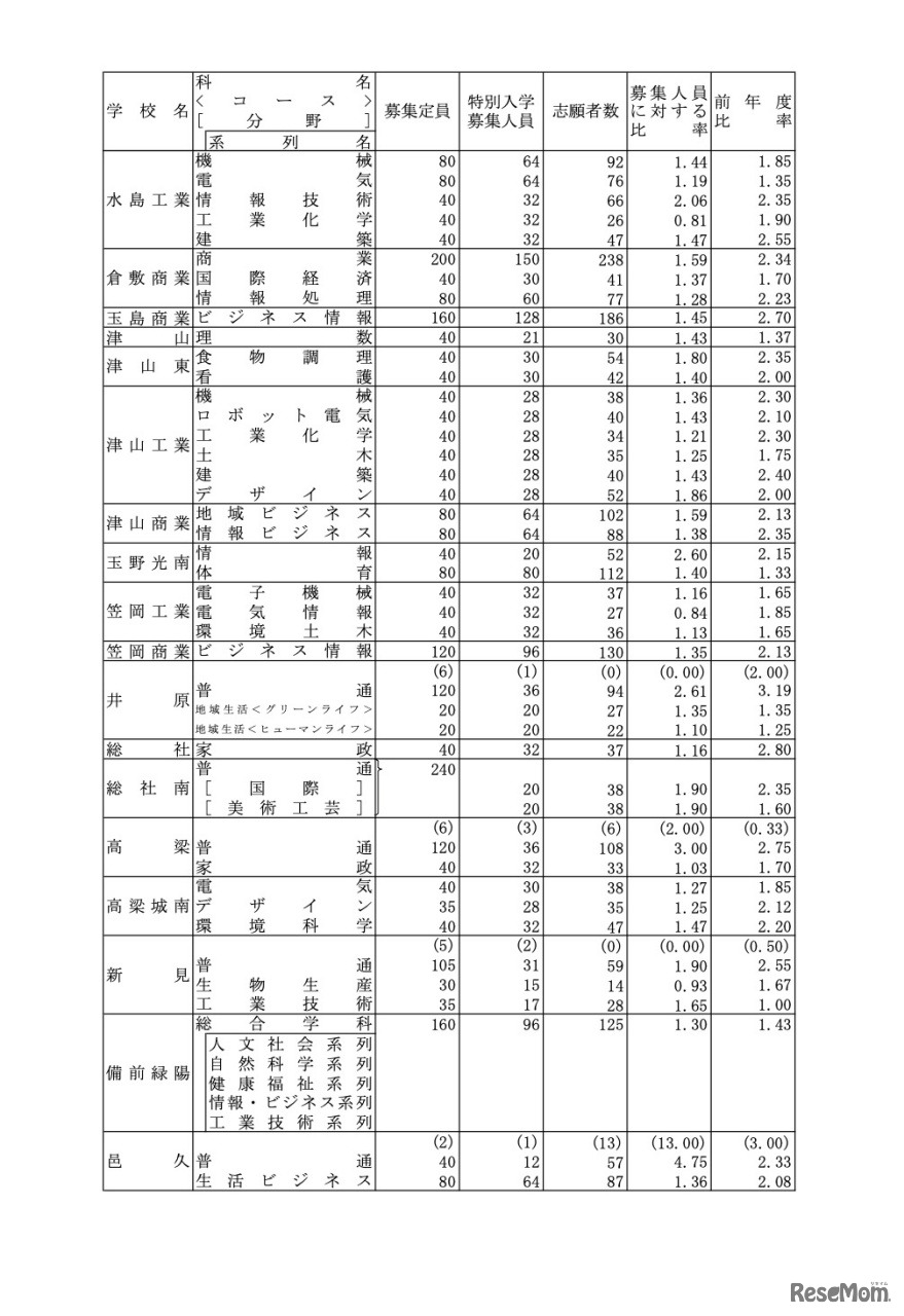 画像出典:岡山県教育委員会 令和5年度岡山県公立高等学校特別入学者選抜等志願者数(県立全日制)