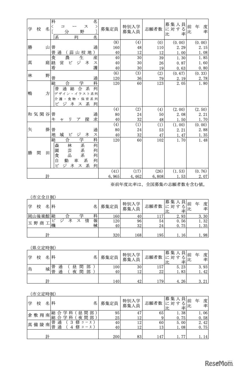 画像出典:岡山県教育委員会 令和5年度岡山県公立高等学校特別入学者選抜等志願者数(県立全日制、他)