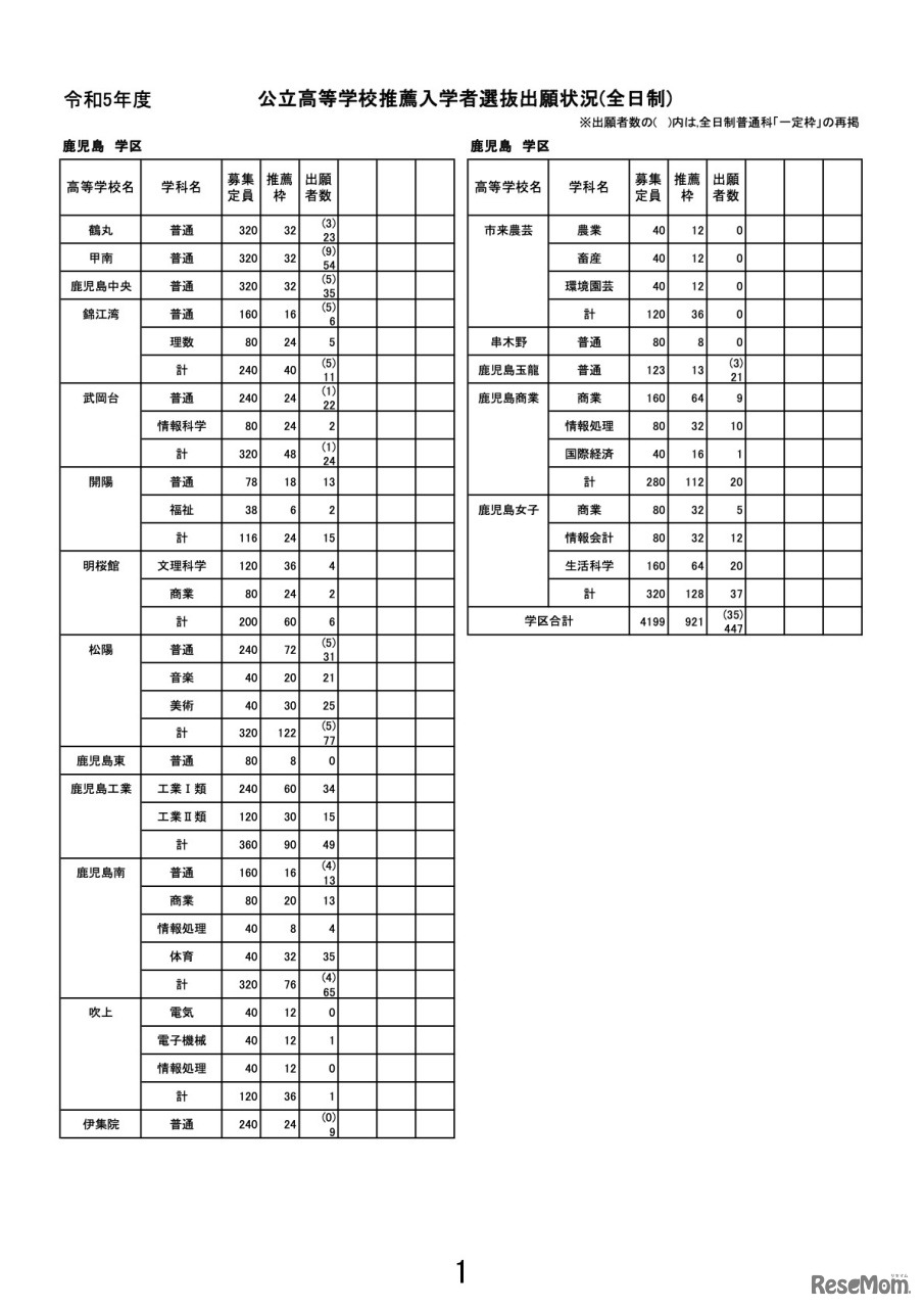 令和5年度鹿児島県公立高等学校推薦入学者選抜出願状況(全日制)