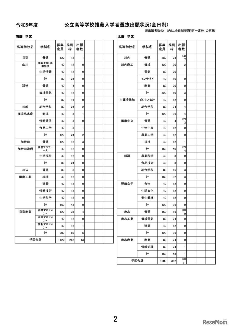 令和5年度鹿児島県公立高等学校推薦入学者選抜出願状況(全日制)