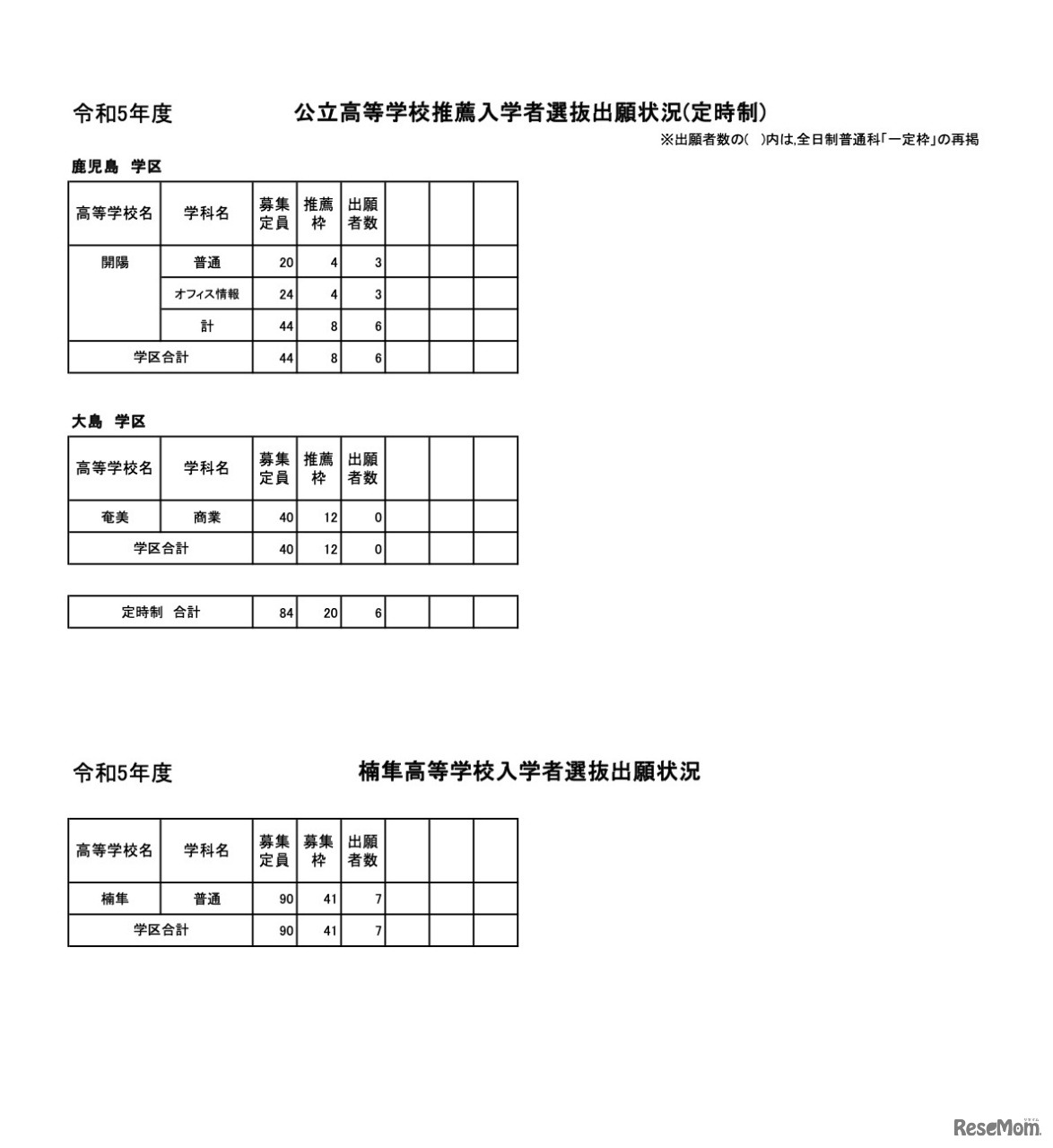 画像出典:鹿児島県教育委員会 令和5年度鹿児島県公立高等学校推薦入学者選抜出願状況(定時制)/楠隼高等学校入学者選抜出願状況