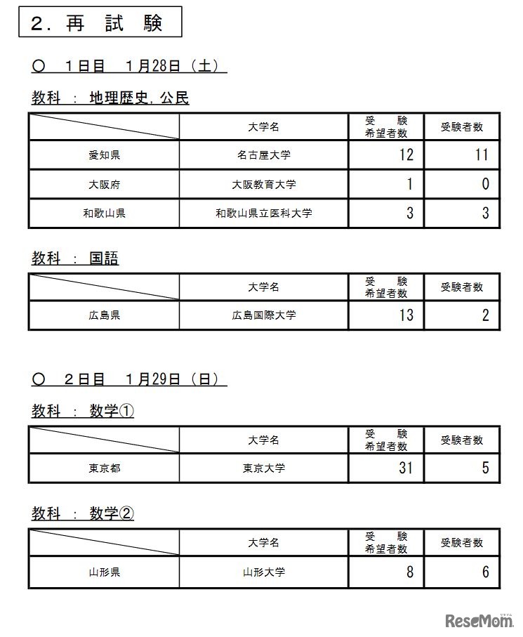 令和5年度大学入学共通テスト再試験受験状況