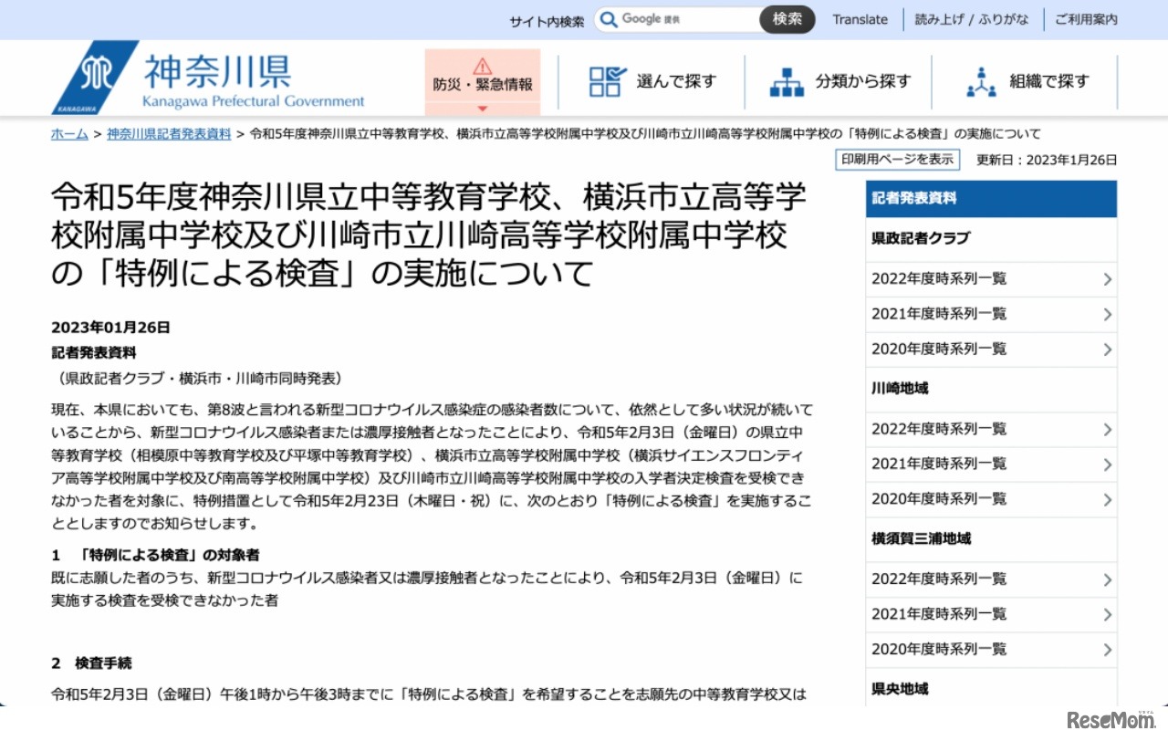 神奈川県教育委員会は2023年1月26日、2023年度神奈川県公立中高一貫校の入学者決定検査において「特例による検査」を実施すると発表した。実施日は2月23日。対象は新型コロナ感染者または濃厚接触者となったことにより、2月3日の入学者決定検査を受検できなかった者。