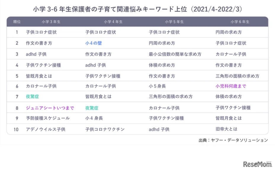Yahoo! JAPANが提供する事業者向けデータソリューションサービスは2023年1月18日、小学生の子供をもつ保護者が、検索する「小学3~6年生保護者の子育て関連悩みキーワード」についてのランキングを公表。「小4の壁」や「子供コロナ症状」がランクインした。