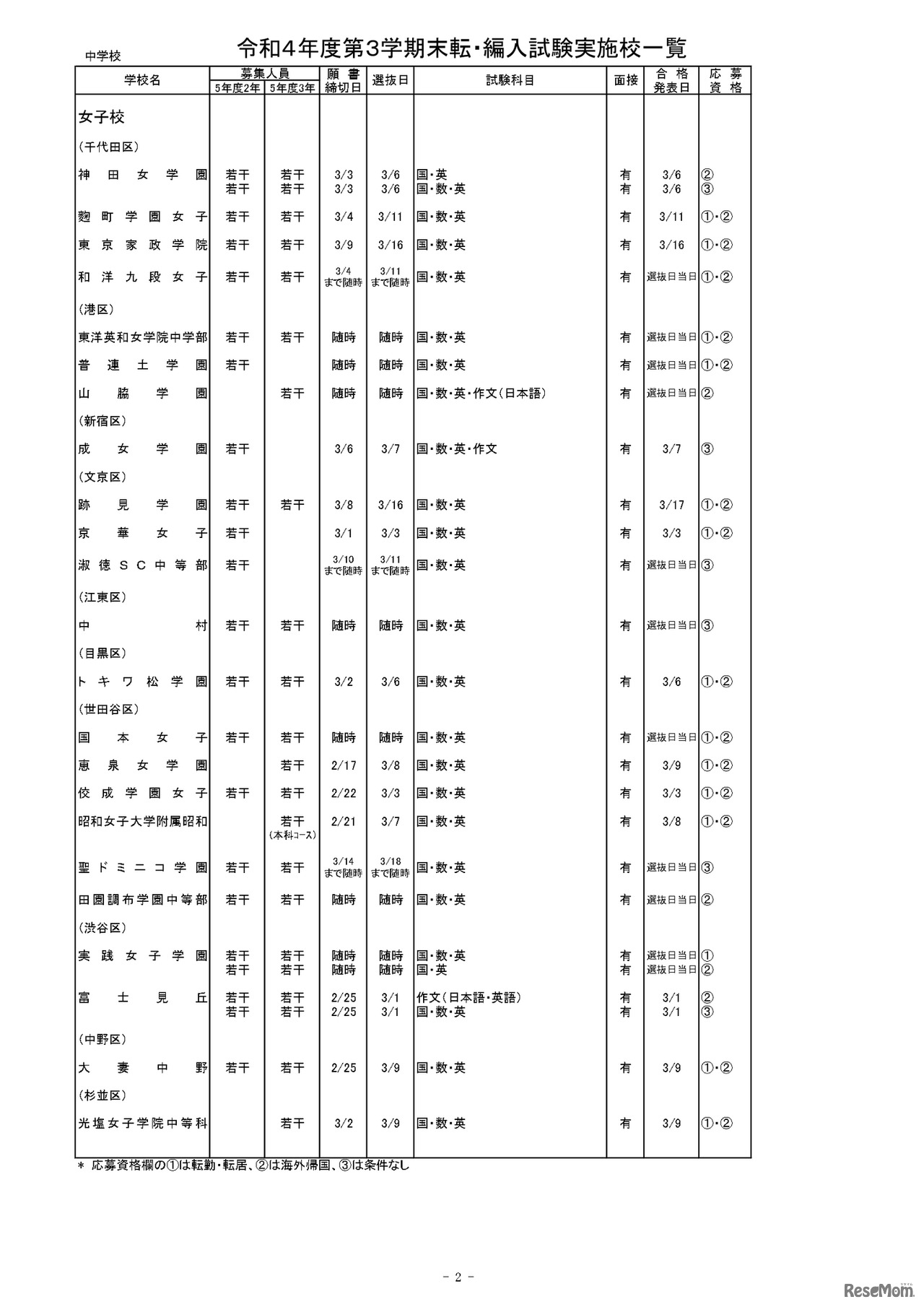 東京都は2023年2月16日、2022年度(令和4年度)第3学期末に実施する都内私立中学校および高校の転・編入試験について発表した。中学校は海城や東洋英和女学院等83校、高校は成城や田園調布学園等102校(うち全日制は93校)で転・編入試験を行う。