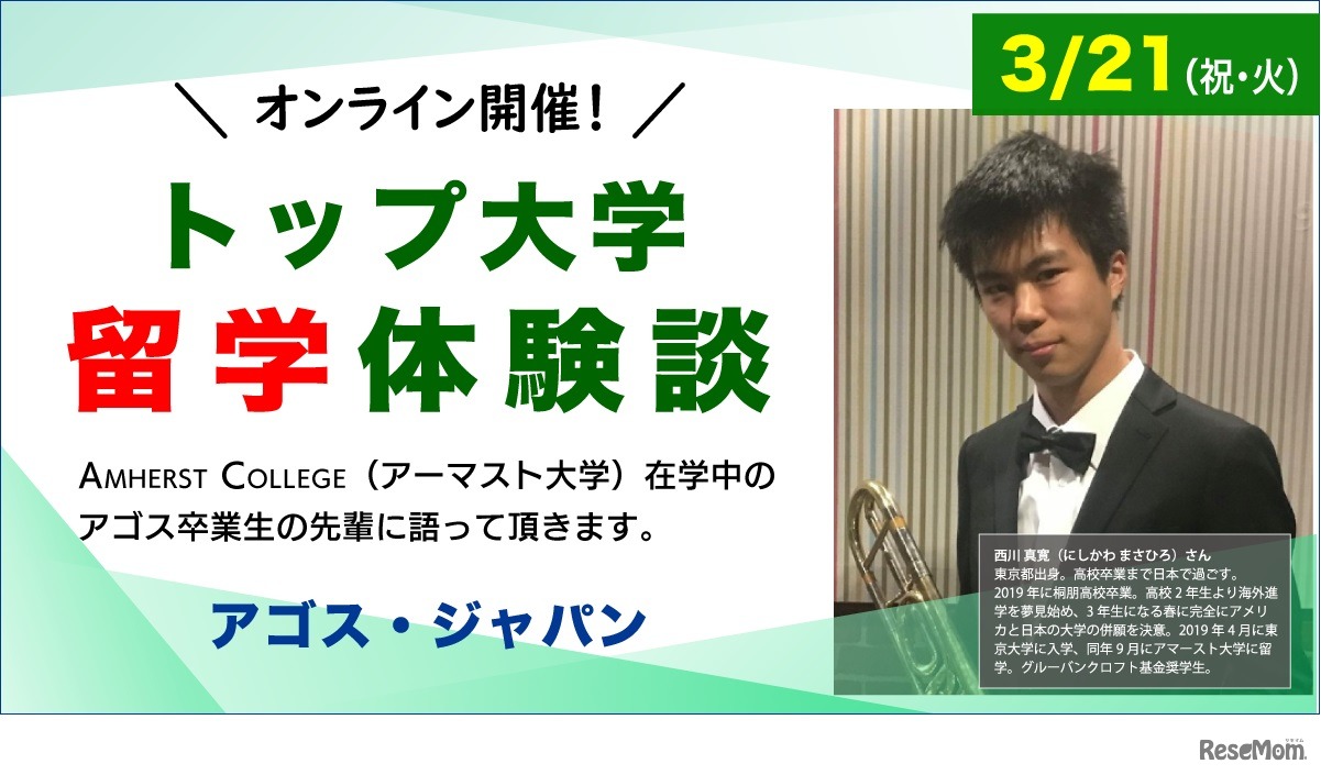 アゴス・ジャパンは2023年3月21日、学生対象のオンラインセミナー 「トップ米国大学留学体験談セミナー『Amherst College(アマースト大学)』」を開催する。アゴス卒業生が、実際の留学のようすや留学準備の道のり、成功の秘訣等を語る。