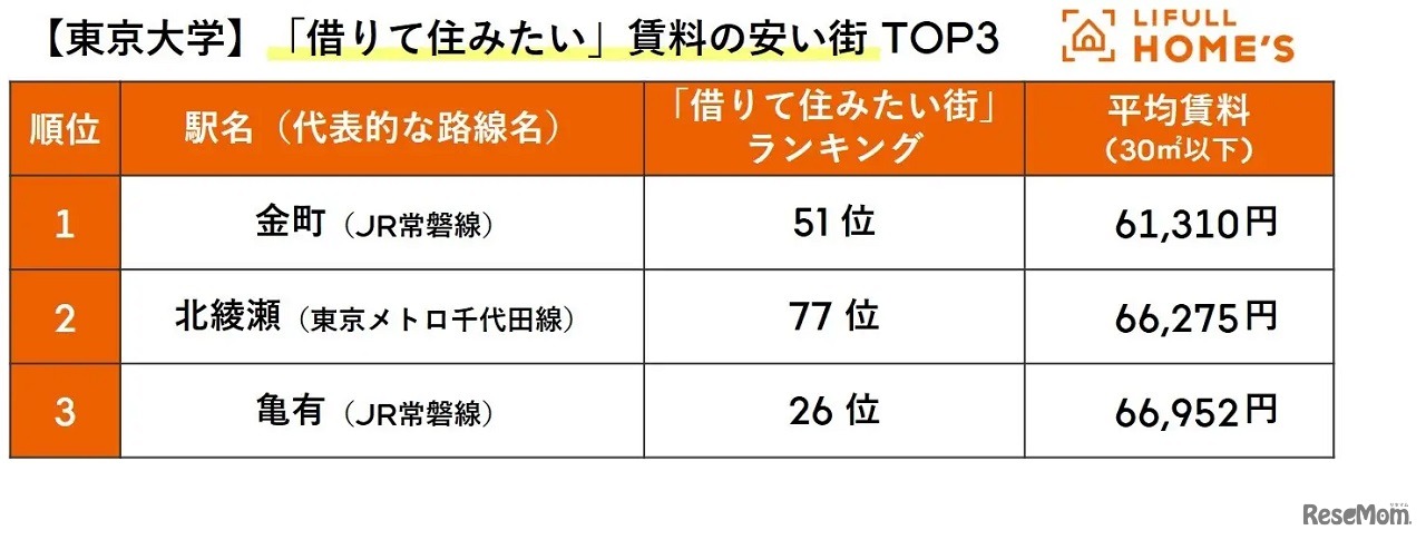 画像出典:LIFULL 近くにある「借りて住みたい街」の中で賃料の安い駅ランキングTOP3 東京大学