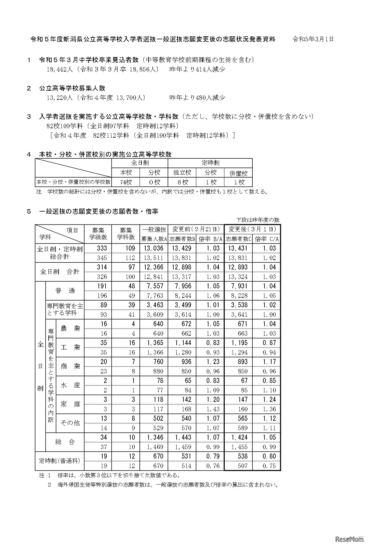 新潟県教育庁は2023年3月1日、2023年度(令和5年度)新潟県公立高校入試における一般選抜の志願変更後の志願状況を発表した。学校別の志願倍率は、新潟(理数)1.85倍、新潟(普通)1.21倍、新潟南(理数コース)1.72倍など。