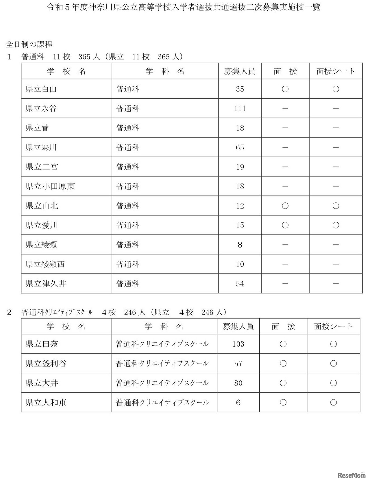 2023年度(令和5年度)神奈川県公立高等学校入学者選抜一般募集 共通選抜2次募集実施校一覧