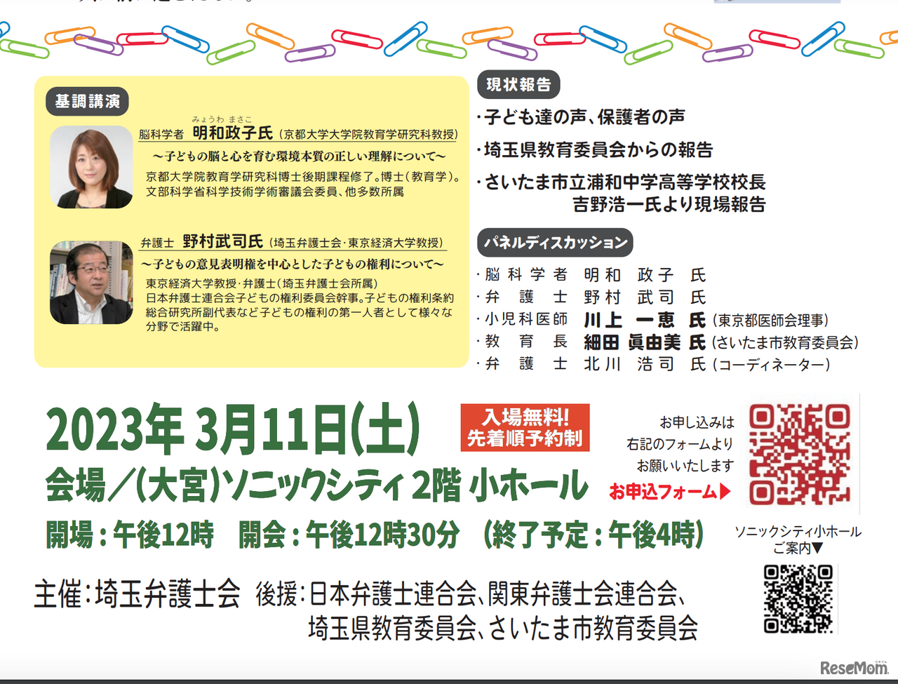 埼玉弁護士会は2023年3月11日、児童・生徒およびその保護者、各学校の校長先生をはじめとする教職員を対象に「コロナ禍における子どもの権利を考えよう」というテーマで市民集会を開催する。会場は大宮ソニックシティ小ホール。入場無料。定員440名。事前申込制。