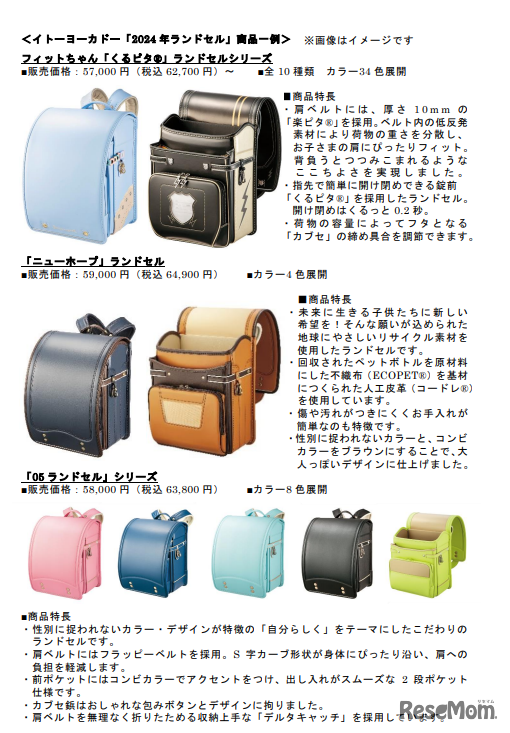 イトーヨーカドーは2023年3月18日、「2024年ランドセル」を全国の約90店舗で順次発売を開始する。性別にとらわれないカラーやデザイン、環境に配慮したリサイクル素材を使用したランドセルが新たに加わった。インターネットでの先行予約は3月1日から開始している。