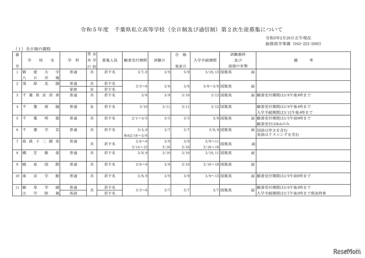 千葉県は2023年3月1日、2023年度(令和5年度)千葉県私立高等学校の第2次募集について発表した。全日制課程は東京学館や暁星国際、千葉明徳等14校17学科、通信制課程は1校1学科で実施する。