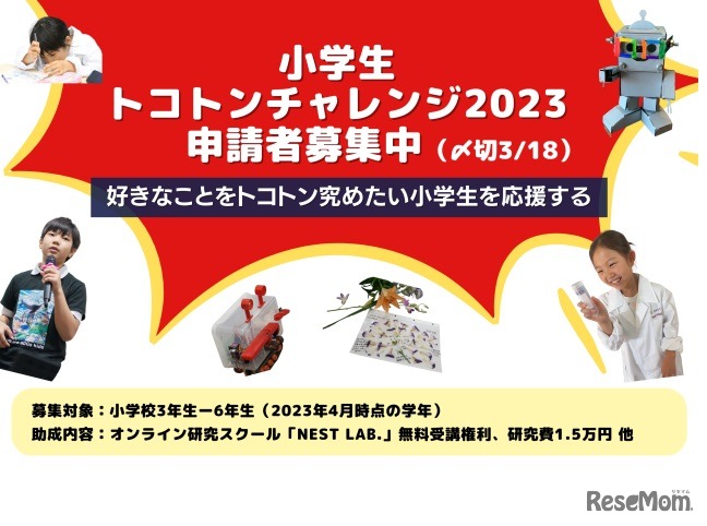 NEST LAB.は、小学生新3年~6年生を対象に「小学生トコトンチャレンジ2023」の募集を開始した。好きな実験や、ものづくりを究めたい小学生を応援する教育プログラム。締切は2023年3月18日午後6時まで。
