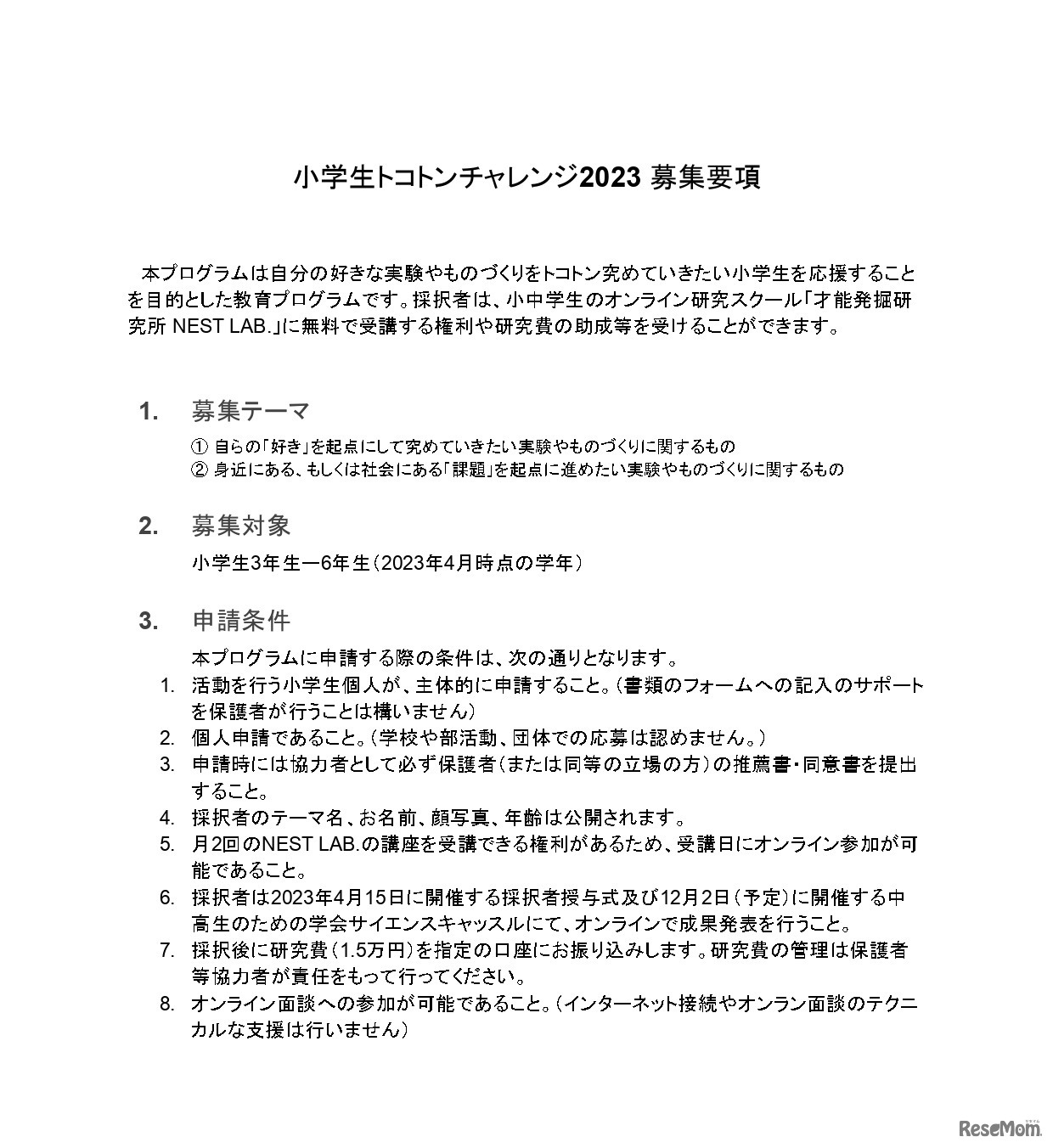NEST LAB.は、小学生新3年~6年生を対象に「小学生トコトンチャレンジ2023」の募集を開始した。好きな実験や、ものづくりを究めたい小学生を応援する教育プログラム。締切は2023年3月18日午後6時まで。