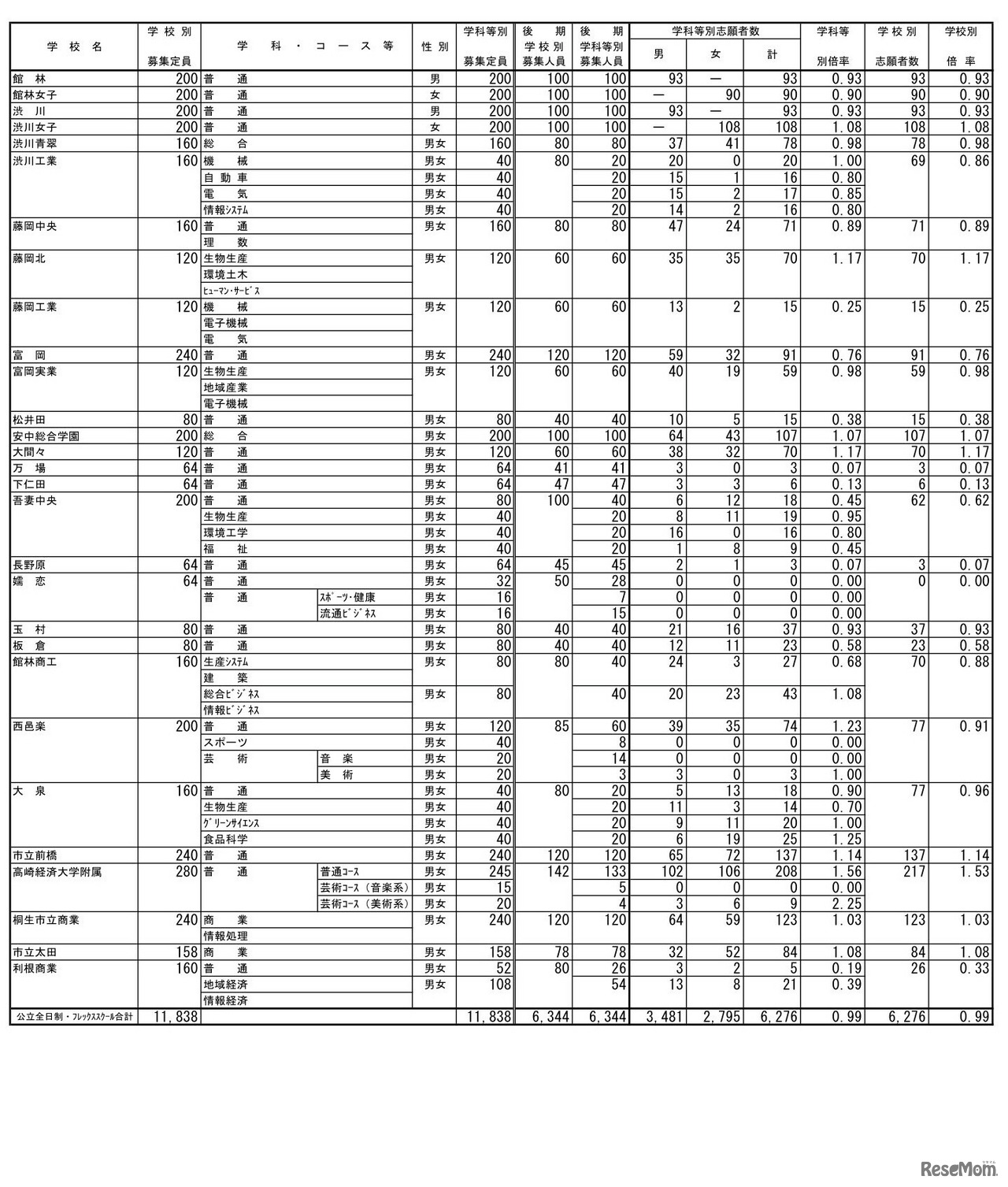 群馬県教育委員会は2023年3月6日、2023年度(令和5年度)群馬県公立高等学校入学者後期選抜の確定志願状況を公表した。全日制・フレックススクールの後期募集人員6,344人に対し、志願者は6,276人、平均倍率は0.99倍。学校別では県立前橋(普通)1.17倍等。