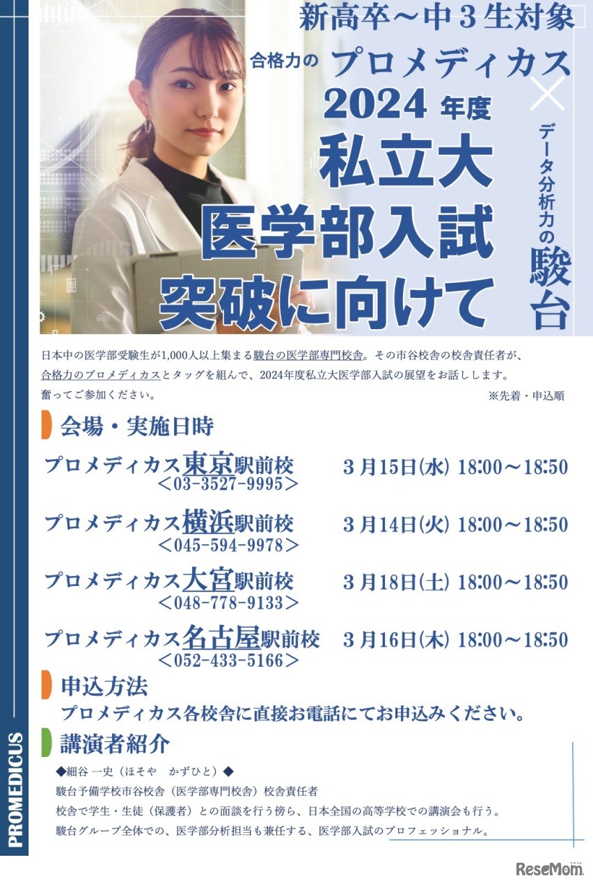駿台グループ医学部予備校プロメディカスは2023年3月、4校舎にて「2024年度説明会 私立大医学部入試突破に向けて」を開催する。対象は新高卒~中学3年生。申込みは先着順。プロメディカス各校舎にて、電話で受け付ける。