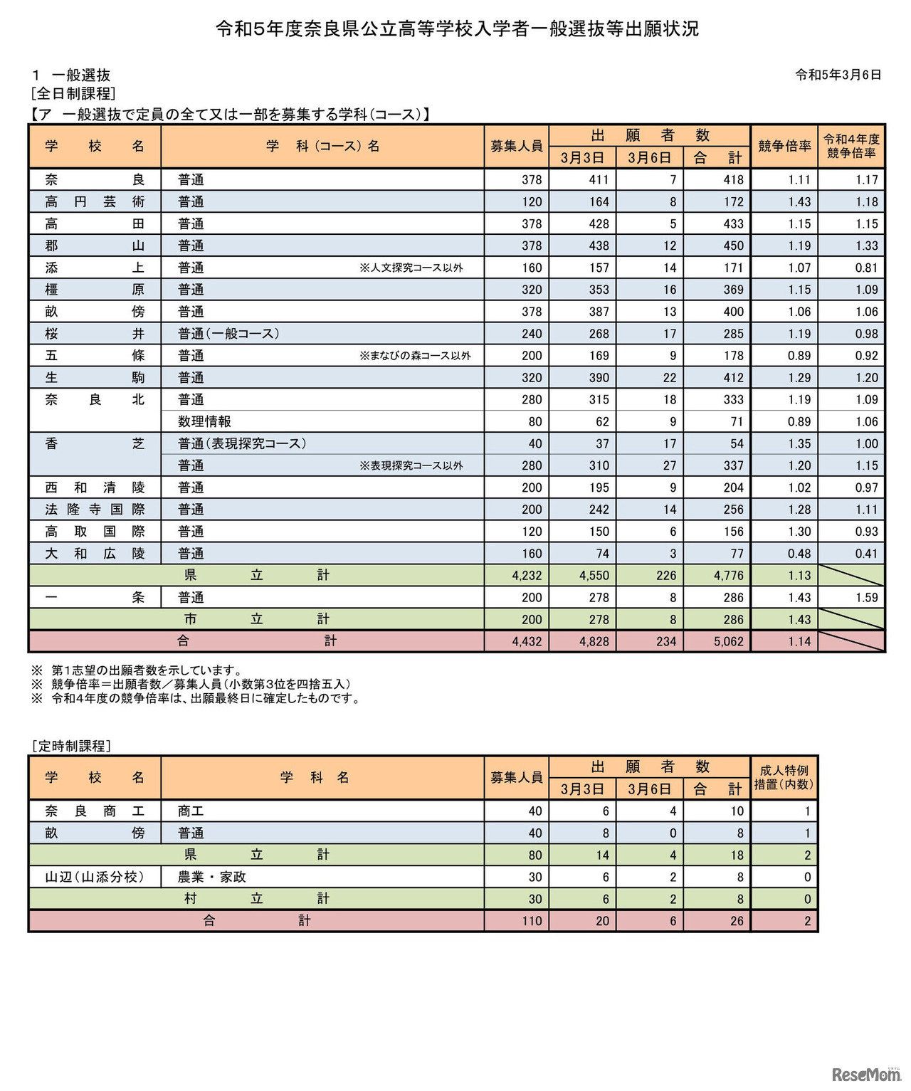 奈良県教育委員会は2023年3月6日、2023年度(令和5年度)奈良県公立高等学校入学者一般選抜の確定出願状況を発表した。全日制は募集人員4,432人に対し、志願者は5,062人、競争倍率は1.14倍。学校・学科別では奈良(普通)1.11倍、畝傍(普通)1.06倍等。