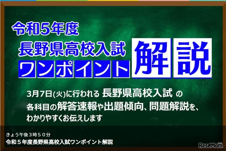 長野県公立高等学校の後期選抜が2022年3月7日に行われる。NBS長野放送は入試当日午後3時50分~4時50分まで「令和5年度長野県高校入試ワンポイント解説」を放送する。