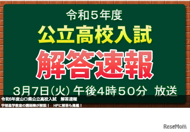 山口県公立高校入試が2023年3月7日に行われる。KRY山口放送、tysテレビ山口、yab山口朝日の3局は、試験当日の午後4時50分から「令和5年度公立高校入試解答速報」をそれぞれ放送する。TOP-U予備校宇部進学教室の講師陣が各TV局の解答速報に協力する。