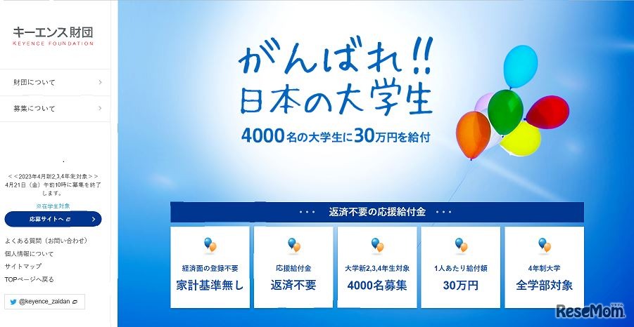 キーエンス財団は、大学新2~4年生を支援対象とした「がんばれ!日本の大学生 応援給付金」の募集を2023年3月6日から開始した。今年は4,000人の募集を行い、応募者の経済状況は問わず、4年制の学部・学科に所属している学生に一時金30万円(返済不要)を給付する。