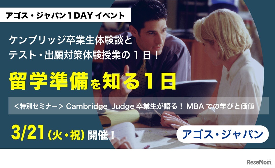アゴス・ジャパンは2023年3月21日、体験授業「留学準備を知る1日」をオンライン開催する。ケンブリッジMBA卒業生による留学体験談とTOEFL・IELTS・GMAT・出願エッセイ対策を1日で体験できるセミナー、個別相談会。参加費無料。