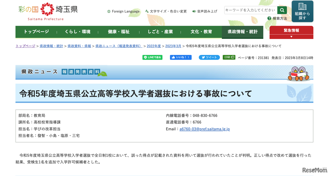 埼玉県は2023年3月8日、令和5年度(2023年度)埼玉県公立高等学校入学者選抜における事故について発表した。全日制1校において、誤った得点が記載された資料を用いて選抜が行われ、正しい得点で改めて選抜を行った結果、受検生1名を追加で入学許可候補者としたという。