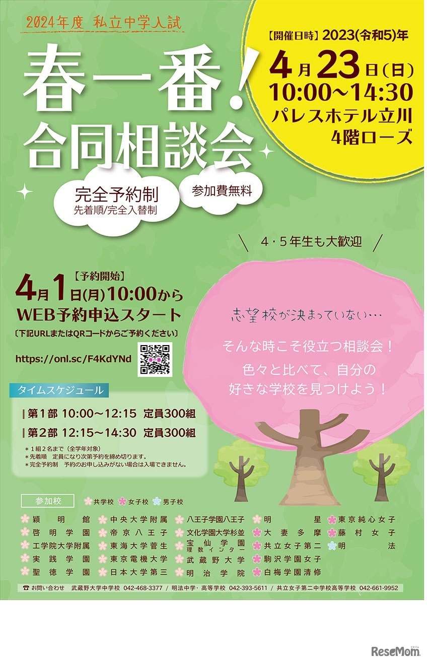 穎明館や大妻多摩等、私立中学23校が参加する「春一番!合同相談会」が、2023年4月23日にパレスホテル立川で開催される。参加無料。事前申込制。小学4・5年生も大歓迎。