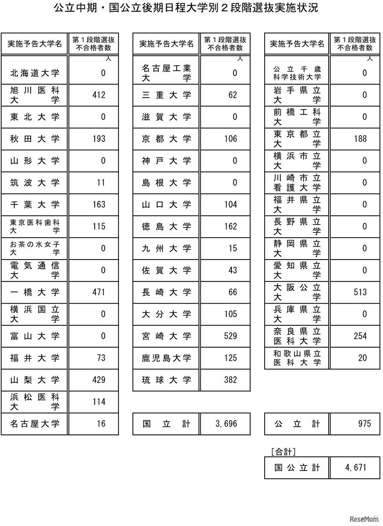 文部科学省は2023年3月10日、2023年度(令和5年度)国公立大学入学者選抜(中期・後期日程)の2段階選抜実施状況を発表した。2段階選抜は25大学33学部で実施し、4,671人が不合格となった。2段階選抜による不合格者がもっとも多かったのは「宮崎大学」の529人であった。