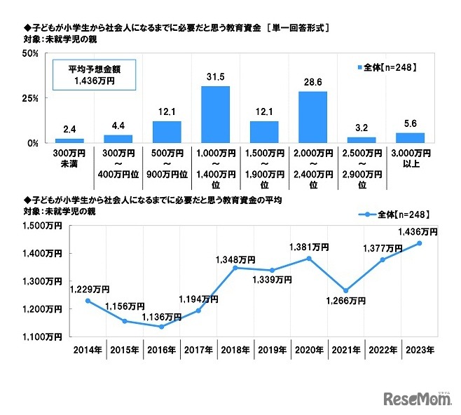 子供が小学生から社会人になるまでに必要な教育資金の平均予想金額が、調査開始以来最高額の1,436万円となったことが、ソニー生命保険が実施した調査から明らかになった。コロナ禍に続く物価高騰により、教育費の増加を懸念、不安視するようすがうかがえる。