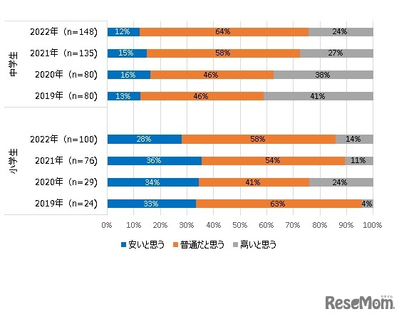 NTTドコモ モバイル社会研究所が2022年11月に実施した、子供のケータイ利用に関する調査によると、子供のスマホの利用料金は「3,000円未満」が増加傾向。中学生の利用料金に対する保護者の意識は、「高い」が減少し、「安い」「普通」が約8割を占めることがわかった。