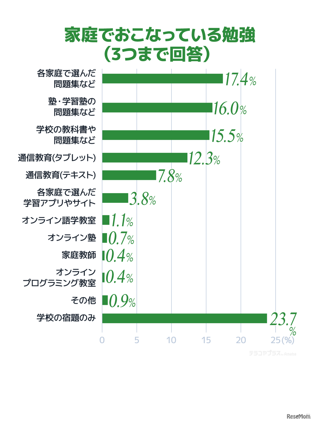 「テラコヤプラス by Ameba」は、全国の小学生の保護者600人を対象に「子供の家庭学習」についてインターネット調査を実施。8割の小学生が宿題以外の勉強も自宅で行っており、勉強にスマートフォンやタブレット端末を活用していることが明らかとなった。