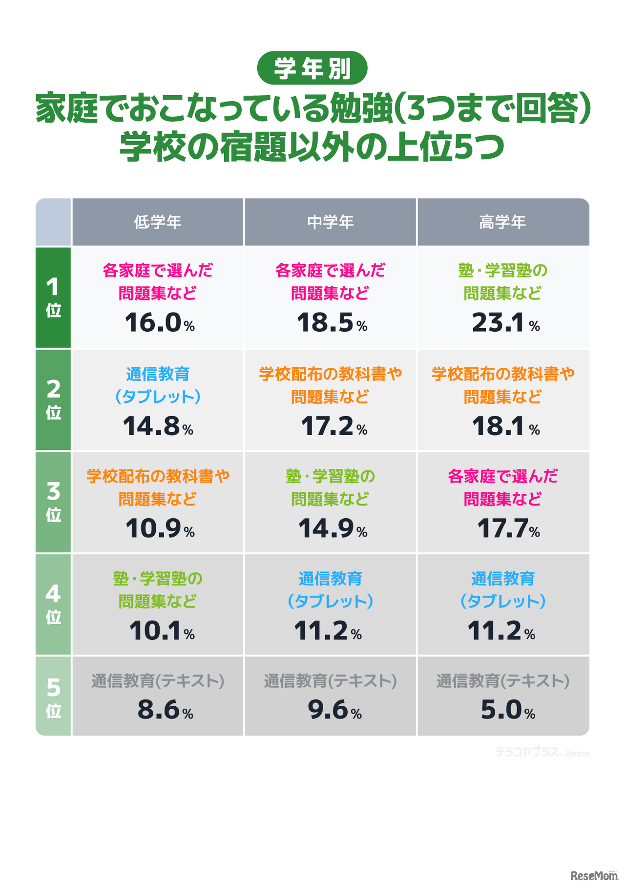 画像出典:CyberOwl 家庭で行っている勉強 学校の宿題以外の上位5つ