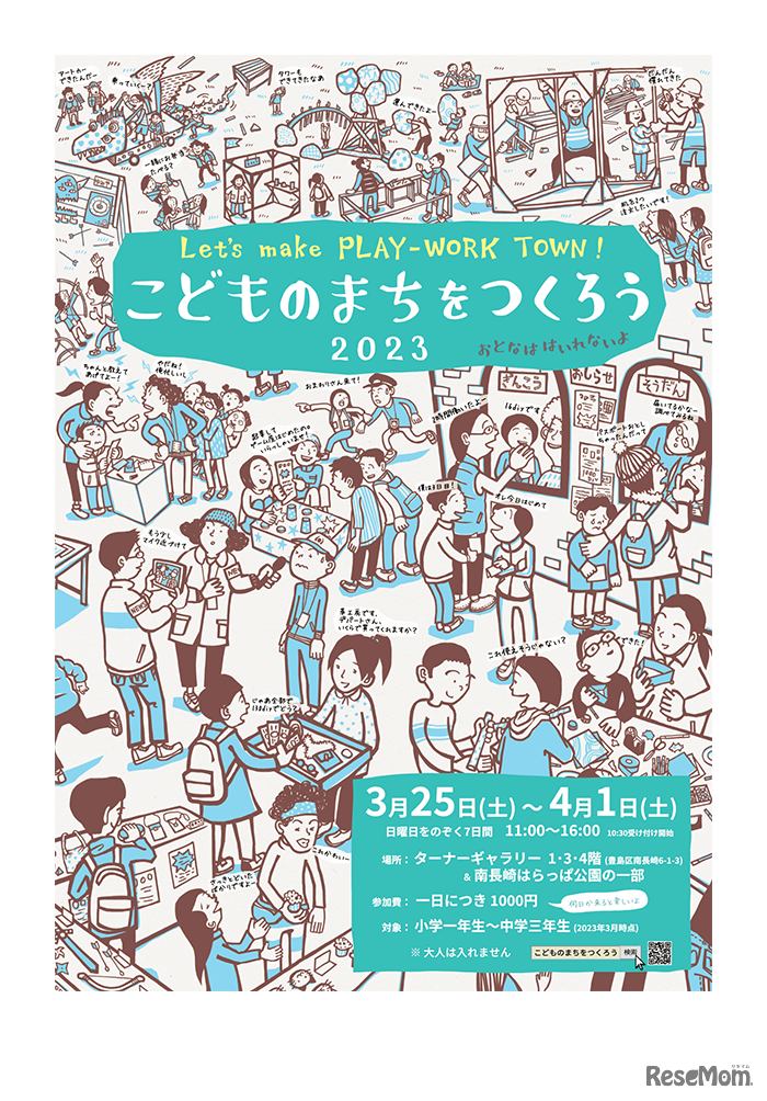 PLAY-WORK実行委員会は2023年3月25日から4月1日の日曜日を除く7日間、2023年3月時点の小中学生を対象に「Let's make PLAY-WORK TOWN! こどものまちをつくろう 2023」を開催する。会場は豊島区ターナーギャラリー。定員1日150名。参加費1日につき1,000円(税込)。