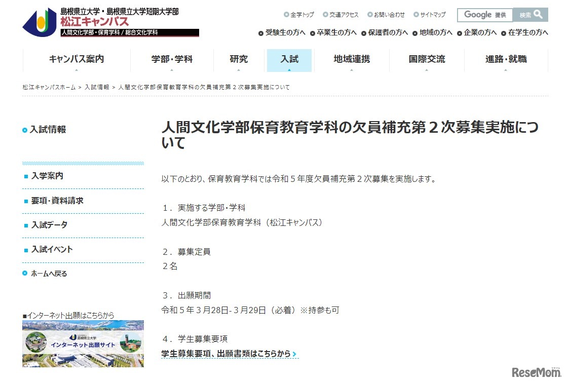 河合塾の大学入試情報サイト「Kei-Net」は、2023年度国公立大学欠員補充2次募集を発表している大学の一覧を掲載した。3月15日時点で島根県立大学、長崎大学、筑波技術大学の3校が募集している。