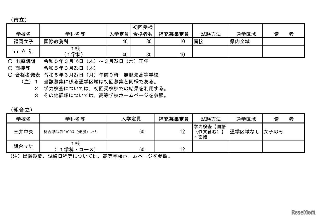 福岡県教育委員会は2023年3月15日、2023年度(令和5年度)公立高等学校入学者選抜における補充募集について発表した。全日制は、嘉穂、小倉南等36校(組合立含む)で1,044人を補充募集する。