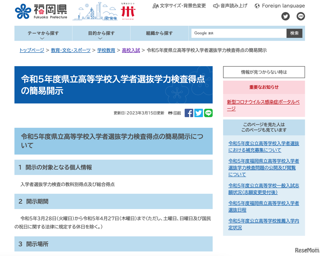 福岡県は2023年3月15日、令和5年度(2023年度)県立高等学校入学者選抜で学力検査得点の簡易開示を行うことを発表した。開示の対象となる個人情報は、入学者選抜学力検査の教科別得点と総合得点。開示は受検した各県立高等学校で行う。