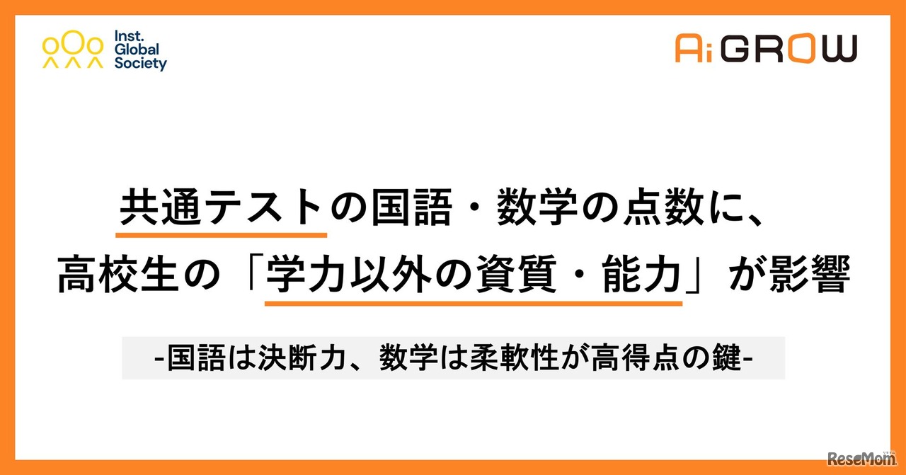 IGSは2023年3月16日、共通テストの「国語」「数学」の点数には、学力以外の資質・能力が影響しているとする分析結果を公表した。特に国語は高校1年生・2年生時点の「決断力」の高さ、数学IAは高校3年生時点の「柔軟性」の高さが、高得点に影響していたという。