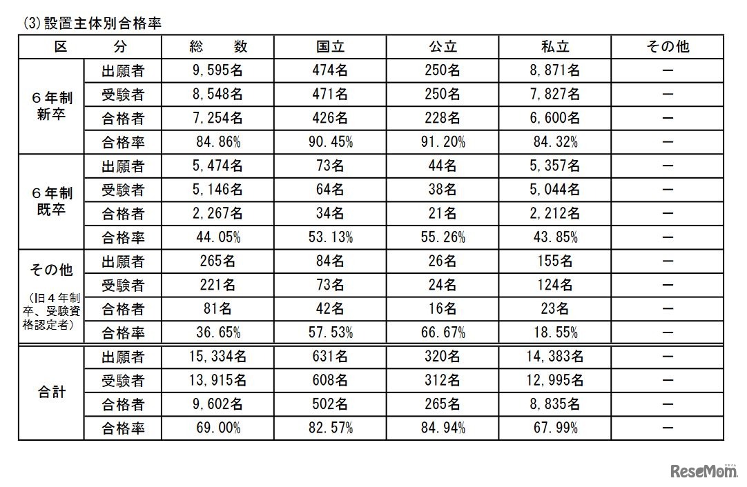 画像出典:厚生労働省 第108回薬剤師国家試験の結果(設置主体別合格率)