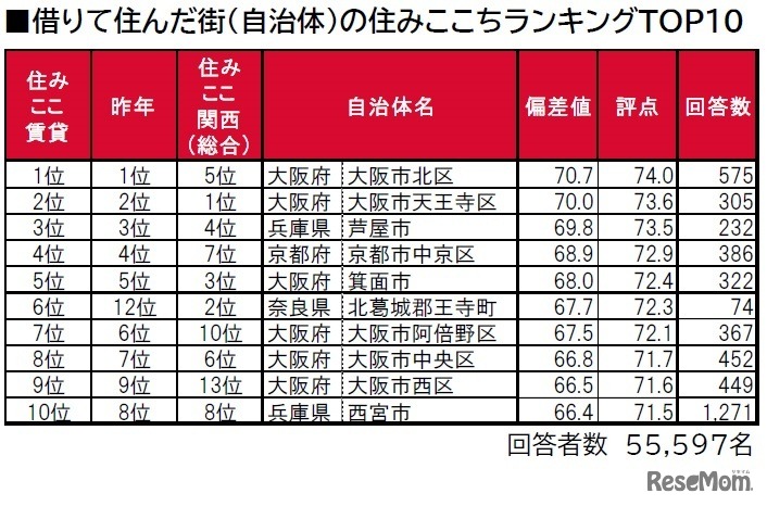 大東建託は2023年3月15日、「借りて住んだ(賃貸)&買って住んだ(持家)街の住みここちランキング2022<関西版>」を発表した。賃貸1位は2年連続「大阪市北区」、持家1位は「大阪市中央区」となった。