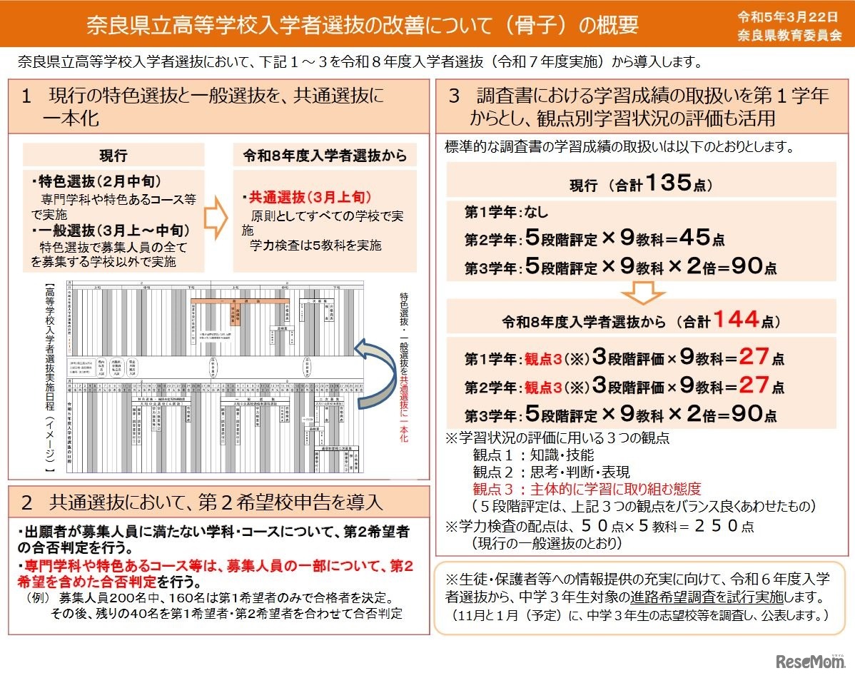 奈良県教育委員会は2023年3月22日、奈良県立高等学校入学者選抜の改善について骨子の概要を公表した。2026年度(令和8年度)入学者選抜から、現行の特色選抜と一般選抜を「共通選抜」に一本化し、第2希望校申告を導入する。調査書の学習成績は、第1学年から取り扱う。