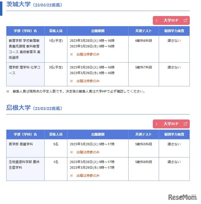 河合塾の大学入試情報サイト「Kei-Net」は、2023年度国公立大学欠員補充2次募集を発表している大学の一覧を掲載した。3月22日時点で茨城大学、島根大学、県立広島大学等の11校が募集している。